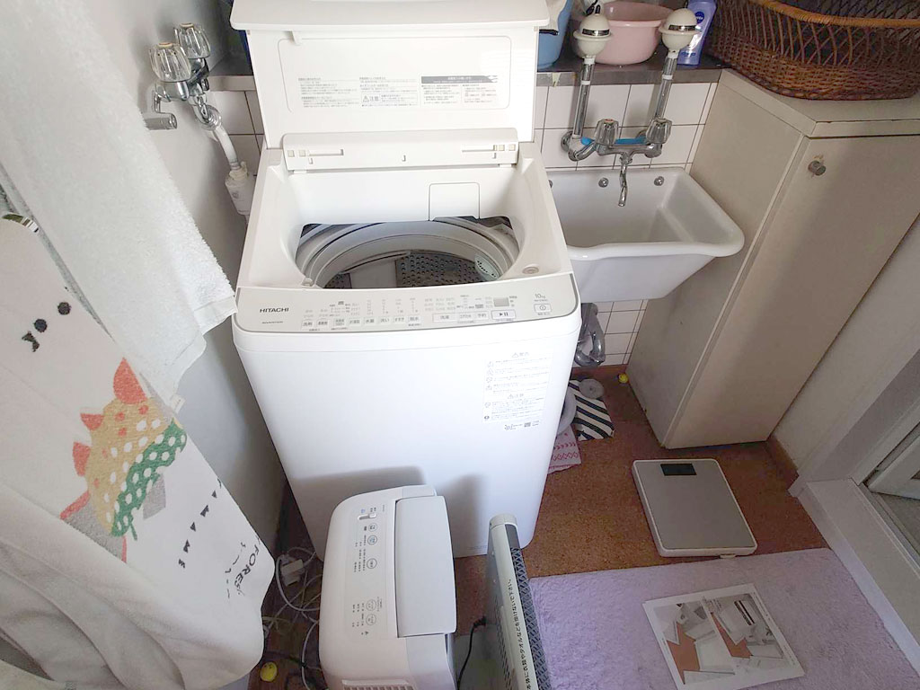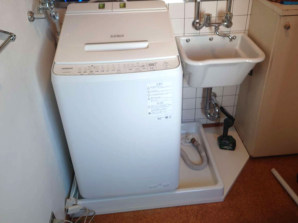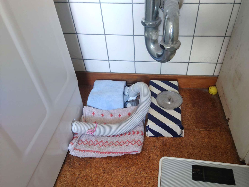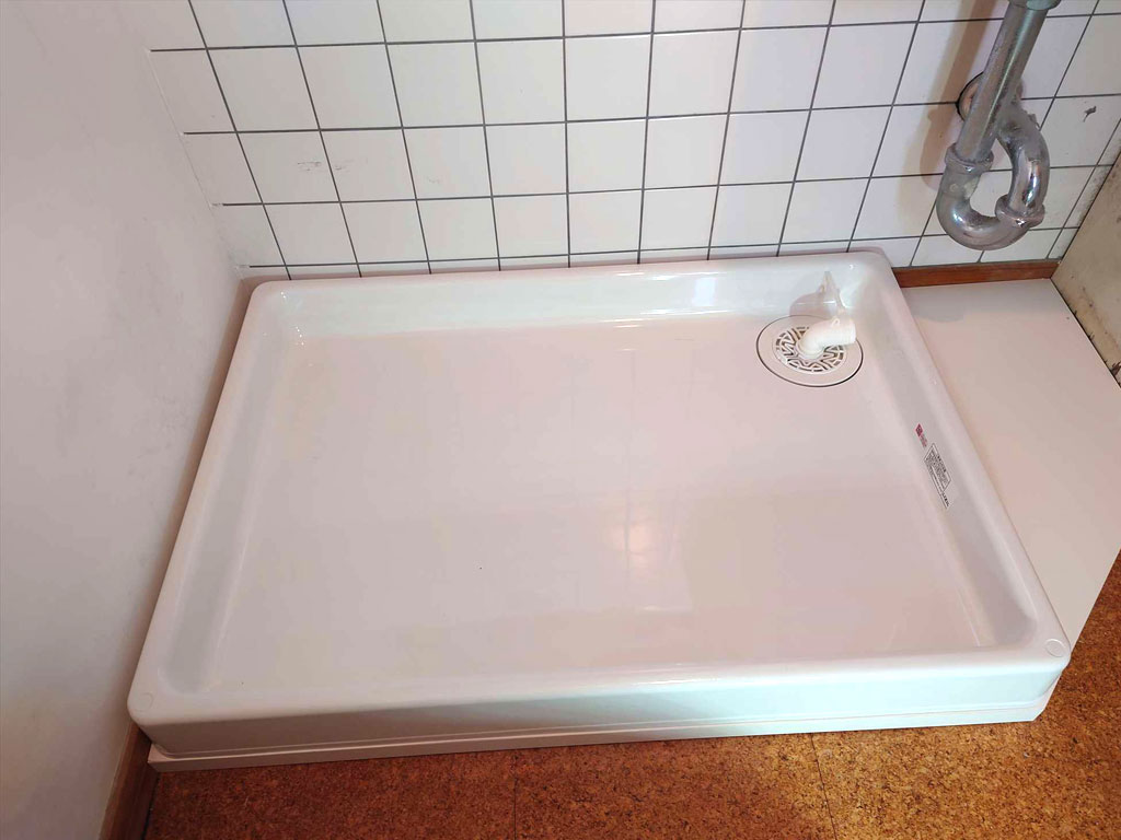 2階である点と補修跡を隠す意味で洗濯機パンを使用する形に変更しています。